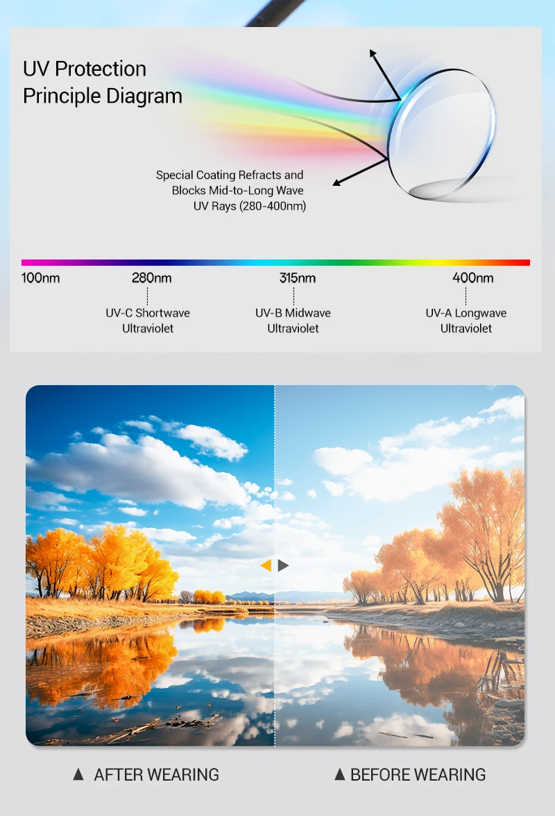 [Lens introduction] The lens is light, tough and not easy to deform. Blocks harmful UVA, UVB, UVC and blue light with UV 400 protective coating. These lenses offer high clarity, impact and scratch resistance, and are lightweight for all-day wear.